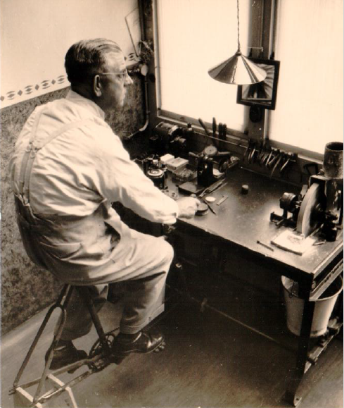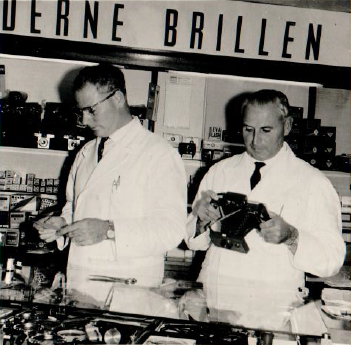 De klanten fietsten onder het genot van een kopje surrogaat koffie, met het uitwisselen van het laatste nieuws hun bril bij elkaar. Er was ruilhandel en mocht de nood hoog zijn kreeg men toch een bril. Je hielp elkaar gewoon. De glazen werden toen nog met de hand geslepen. Daarom droeg men witte jassen tegen het glasstof.